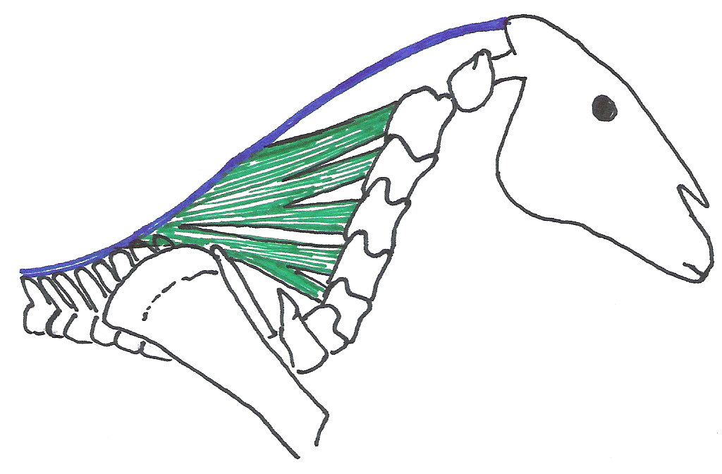 Kuva 1. Hevosen kaulan rakenne. Ylinnä näkyy niskaside, takaraivosta säkään kaulan ylälinjaa pitkin kulkeva vahva ligamentti. Sen alla kaulanikamista säkään kiinittyneitä lihaksia ja kaularanka. Huomaa kaularangan loiva S-muoto kaulan luonnollisessa asennossa ja sen kiinityskohta melko alhaalla rinnassa.