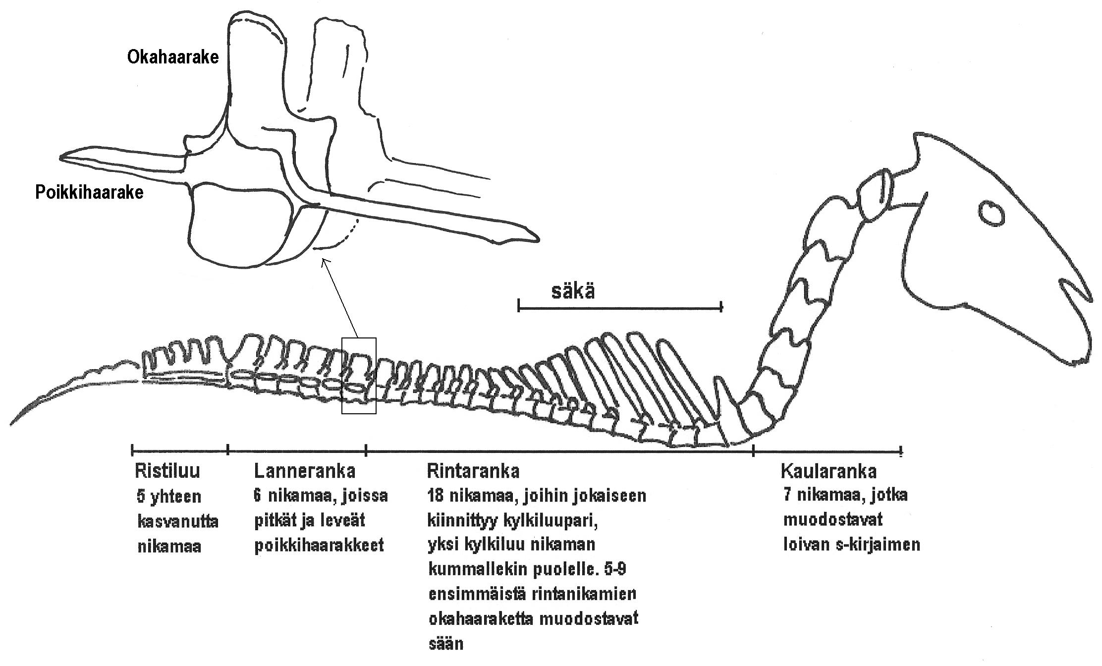 Suurin osa ihmisistä luulee, että hevosen kaularanka kulkee hevosen kaulan ylälinjaa pitkin. Se ei ole totta. Hevosen kaularanka on S-kirjaimen muotoinen. Kalloon kiinnittyessään se on niskan yläreunassa, mutta putoaa aika jyrkästi ja sään edessä ranka kulkee melko alhaalla rinnassa (kuva 1). Tämä on tärkeä asia hevosen selän kannattelun kannalta. S-muoto antaa suuren tilan voimakkaalle lihasjärjestelmälle sään edessä.