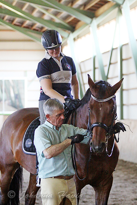 Tässä kuvassa eversti Carde opettaa hevoselle asettumista ja leuan rentouttamista maasta käsin. Ratsukko on Niina Kirjorinne ja Capital, kuva Johanna Havia.