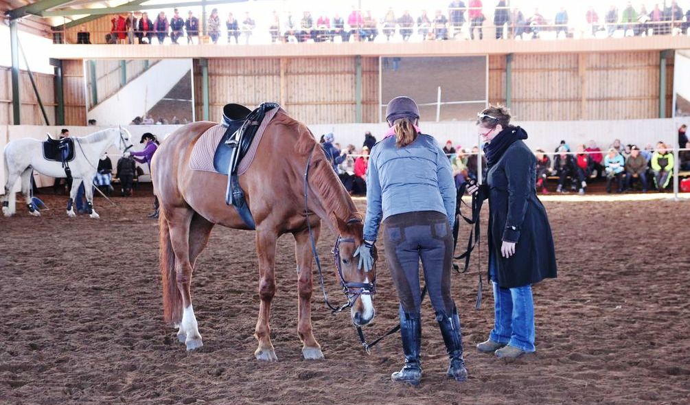 One horse participated in the demonstration because of its strong fearful behaviour. With this particular horse the audience had the chance to participate in the training. The horse was trained using the idea that the brain can learn to override fear. The training began with the horse being brought into the indoor arena, as far away from the audience as possible. First the horse was asked to perform a familiar task of lowering its head with a light pressure on the poll – a skill that the horse had learned to associate with calm.