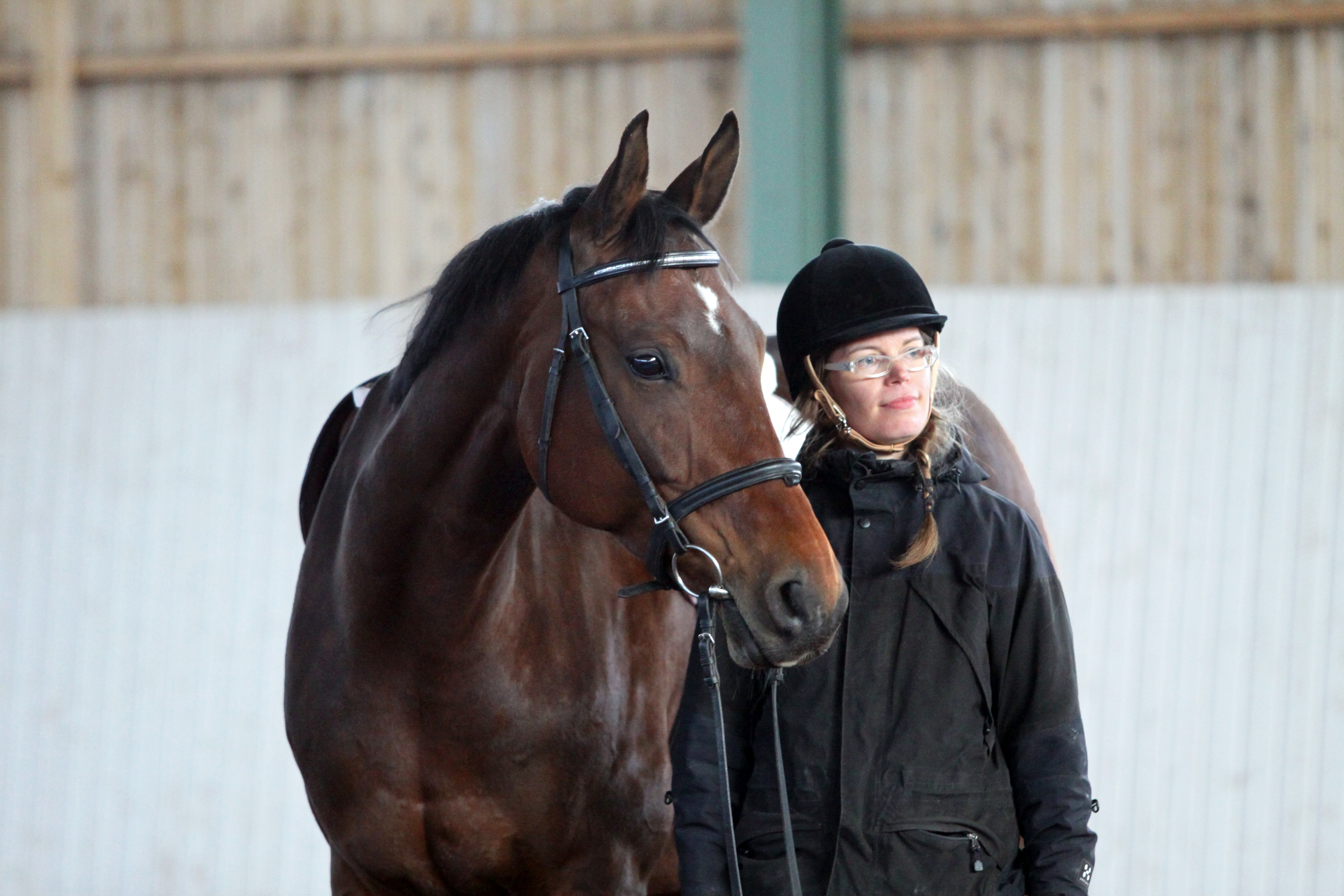 To train the horse the transition from walk to trot, some luring was used. Kaimio was walking next to the horse, moving in the same rhythm with it and then she softly started to run. In the manner typical of herd animals, the horse simply started to mirror her movement. This was another way to produce a voluntary, cadenced movement which again was rewarded. After this, the rider’s light leg aids were added and after a while no other aids were necessary. At the end of the session the horse was moving forward actively and willingly in a good balance, without any resistance, from the lightest of leg aids.