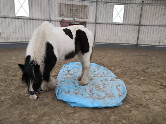 - Tehdään pelottavasta asiasta leikki ja tavoiteltava jännä juttu. Tässäkin on tärkeää, ettei hevonen pääse säikähtämään, se hidastaa tottumista.
